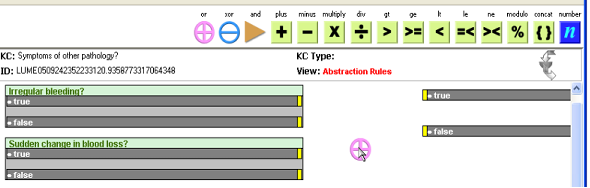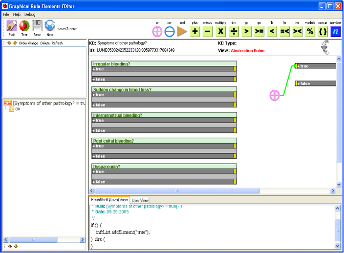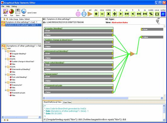- Drag from the port of “true” value of the green colored PPC named “Irregular bleeding” to the “or” icon. You will notice the rule gets further enhanced in both its views – the text and the tree. Successively create links from the “true” of each of the PPC to the “or”. This will complete the creation of your first rule in GreEd. Click on the [Save] button. You will the rule appear in the upper left panel where the saved rules are visible.