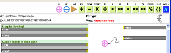 - Create another rule as shown in the figure. This time use the “and” icon instead of “or” and connect the icon to the “false” value of the AKC, and link all the “false” values of the contained data elements to the “and” icon. The rule created means that if all the values of the contained data elements are false, the “Symptoms of other pathology?” is “false” i.e., for the patient to be declared not to have symptoms of other pathology, she must have all the mentioned symptoms negative. Do not forget to save the rule after you have completed authoring it. You may close the GreEd window now and return to Protean.