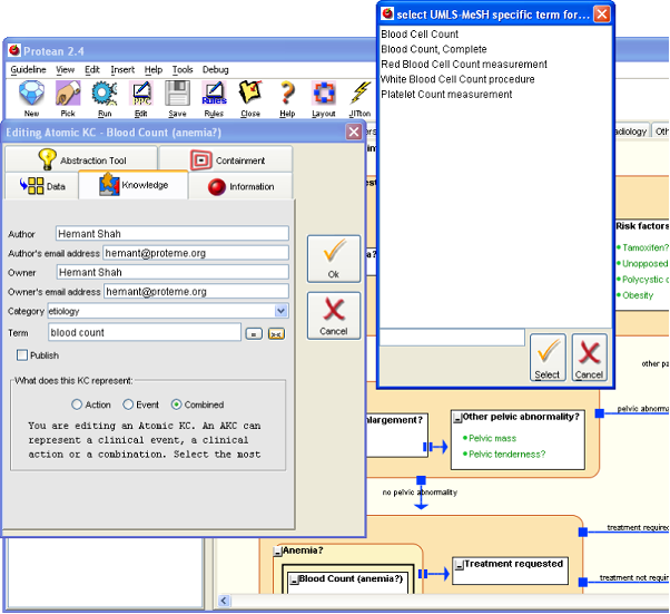 - Open the PPC Editor for the Guideline by clicking on the background. Go to the “Knowledge Tab”, and in the “Disease” field enter “Hypermenorrhoea” and then click on the button [=] next to the field. In a few seconds, you will notice that the text that you had entered has changed to “Menorrhagia” because Protean retrieved all the MeSH equivalents of the term you entered and returned the top one in the list. Thus, the [=] is for getting the best guess semantic MeSH term from UMLS.