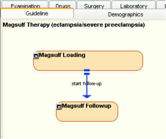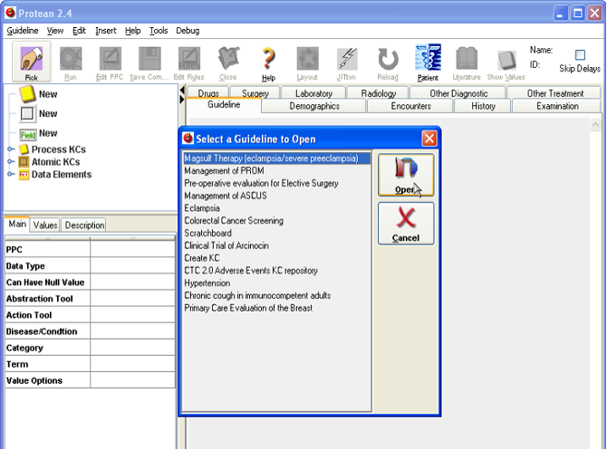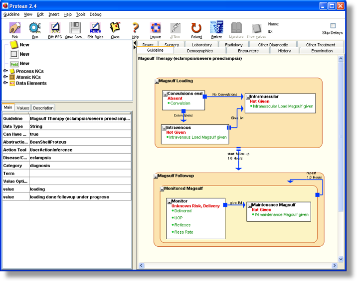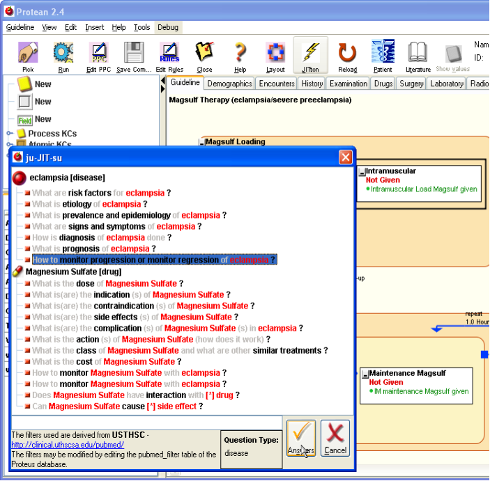 Loading a GuidelineSelecting and loading of a guidelineClick on the [Pick] button. This will open up a small window with a list of sample guidelines available on your system. Select “Magsulf Therapy (eclampsia/severe preeclampsia)” from the list and click on the [Open] button. This loads the selected guideline into Protean. Note: Please note that the Magsulf guideline described here and provided as a sample with Protean, is not an authoritative rendition of magsulf therapy regimens recommended and followed by any institution or authoritative medicial literature resource, but is a variant of one such regimen used here to demonstrate some of the capabilities of the Proteus model. The readers are recommended to look at this guideline only as an example of Proteus capabilities and not at its medical correctness or scientific accuracy. Figure 1. Figure 2. Exploring a Guideline and its KCsThe background of the main panel, which has now changed color to a pale yellow, represents the guideline. You will also notice that some of the buttons on toolbar that were initially disabled are now enabled. The title of the guideline is shown on the upper left corner of the main panel. The rounded rectangles with beige color are Process Knowledge Components (PKCs), representing processes and the white rectangles are the Atomic Knowledge Components that represent actions or events. Note that other KCs may be nested within PKCs. This guideline is for administration of Magnesium Sulfate (magsulf) in cases with severe preeclampsia or eclampsia. The top PKC, “Magsulf Loading” is for deciding the route of the loading dose of magsulf, and the lower PKC is for deciding if subsequent doses have to be administered or not. To decide the route for the loading dose of magsulf, whether the patient is having or has had convulsions is ascertained, in which case, magsulf is given intravenously, otherwise it is given intramuscularly. The first AKC, “Convulsions eval” in the top PKC represents the observation/question about convulsions. The arrow from the AKC to the “Intramuscular” KC represents triggering of the latter based upon an inference that the “Magsulf Loading” PKC will make. Such Inferential Proteus Activity Links (PALs) are denoted by filled square at their trigger end. The label on the PAL may indicate the condition under which the PAL is triggered. In this case, the PAL has a label, “No Convulsions”, indicating its triggering when the patient is found to have no convulsions. Another inferential PAL emanates from the “Convulsions eval” AKC to link it with the third KC, “Intravenous”, with the label “Convulsions”. The labels on PALs are for convenience of the user, they are not really required. The “Intravenous” AKC is also a trigger of a PAL that leads to “Intramuscular”. This PAL is different from Inferential PAL and has pair of parallel bars at its trigger end. This is a sequential PAL, which means that the activity at the trigger end must always ensue after the trigger end activity is complete. In this case, after intravenous magsulf is given, intramuscular is always given. The top PKC is linked with lower PKC, “Magsulf Followup”, by a sequential PAL. This PAL also has another interesting feature; it has a delay of 1 Hour, which means that after the prior activity is over the next activity is triggered after a delay of 1 hour. All types of PALs can have delay associated with them. For the follow up doses, monitoring is required to see if more doses are required and are safe. If the patient has delivered, Magsulf is not required. If the patient has low urinary output, decreased respiration rate, or diminished reflexes, she is at risk of developing Magsulf toxicity, and Magsulf administration has to be stopped. Since monitoring implies repeatedly making an observation or a set of observations, the “Magsulf Followup” PKC has another PKC, “Monitored Magsulf” nested within it with an inferential PAL connecting to itself at a frequency of one hour, signified by the delay of one hour on the PAL. Info PanelWhen a guideline is loaded, the Info Panel shows information about the guideline. Clicking on one of the KCs and selecting it on the main panel of Protean provides more information about the selected KC. If a KC has a description it is shown in a tool tip, which becomes visible if the mouse cursor is kept over a KC for some time. Retrieving miscellaneous information (web link)The PPCs can have information resources associated with them. These are in the form of URLs of the resources. Such information resources are static – which means that they are entered by author/editor of the PPC and the state of the PPC while loaded in Protean does not decide how to filter the contents of the resource. If you click on the “Magsulf Loading” PKC, you will notice that the Literature button on the toolbar becomes enabled. The tool tip of the button shows the URL of the resource associated with the selected PPC. If you clicked the button, the site specified with the URL will be loaded in your browser. (The default browser is Internet Explorer. You can specify a different browser by going to toolè setup) Just-in-Time (JIT) InformationIn addition to static information resources, the AKCs also provide dynamic information resource access. Such resources are called dynamic or Just-in-Time (JIT) because what information is accessed varies with the state of the AKC and its containers. If you selected one of the AKCs by clicking on it, you will notice that the JIT button (fondly called, Jitton) on the toolbar becomes enabled. Clicking on [Jitton] will open up a Just-in-Time information access window, aptly called ju-JIT-su. Select the “Intramuscular” AKC and click on the [Jitton]. The possible questions you may have about the activity at that particular stage are listed in the window. The questions are grouped into different categories depending upon the nature of the AKC fro