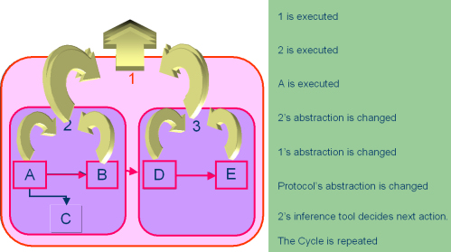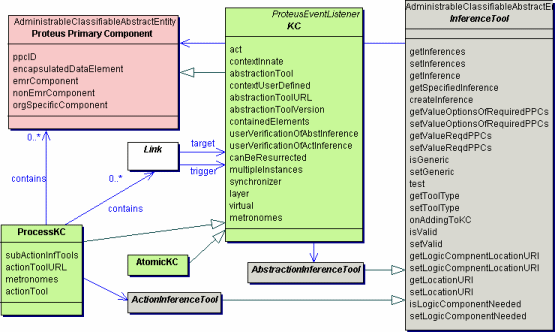 The KCs also have inference tools that are accessed via an interface. There are two types of Inference tools one each to create, abstraction inference or action inference. The abstraction inference creates or updates the abstraction for the KC whenever any data change takes place within it. (E.g., abstraction of the KC ‘Symptoms of diabetes’, in the example may change from unknown to true once values have been filled in its data-elements). The action inference controls the launching of KCs representing other clinical activities within a KC that represents a clinical process. |
