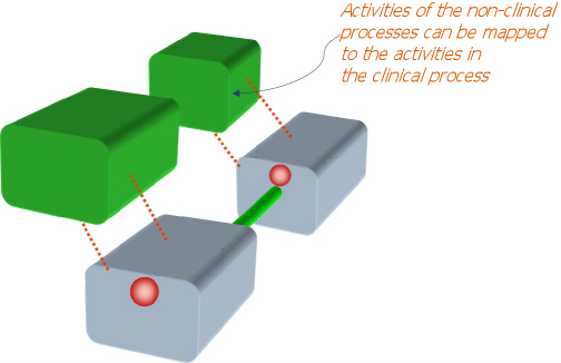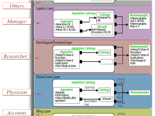 Since a KC represents something distinctly identifiable in terms of clinical activity, KCs are convenient anchor points for components of other (non-clinical) processes in healthcare. For example, though the clinician may be concerned with the information that would help make decisions about cytology and mammography, the healthcare manager would be interested in providing the resources and logistical support to facilitate and optimize the process, and to monitor the activity.