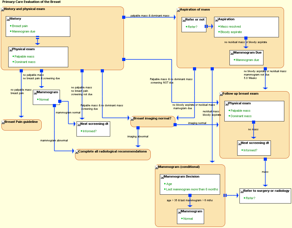 The illustration shows a guideline in PGL, for investigation of a breast lump. Click the figure to see a larger version of the guideline.