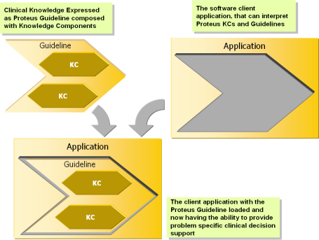 Proteus – (PROcesses and Transactions Editable by Users), is a model for creating executable clinical decision-support guidelines. The name and the abbreviation signify flexibility and maneuverability of guidelines in the hands of physicians. The guidelines in Proteus approach are built from small bits of knowledge in the form of software entities, called knowledge components (KCs). The KCs are discrete, editable, reusable and executable, distributed knowledge entities that represent clinical activity. The design of the KC has been achieved by applying principles of distributed component software architecture to knowledge forms. The KCs can be created and maintained by experts while healthcare professionals access them from remote locations. Because of the independent nature of each of the KCs, a change in one KC does not affect others. Additionally, the KCs capture the data entered, thereby also serving as components of the Electronic Medical Record (EMR). This kind of medical record is far richer than conventional records since it also records the decisions made and the basis of the decisions, in addition to the raw data.